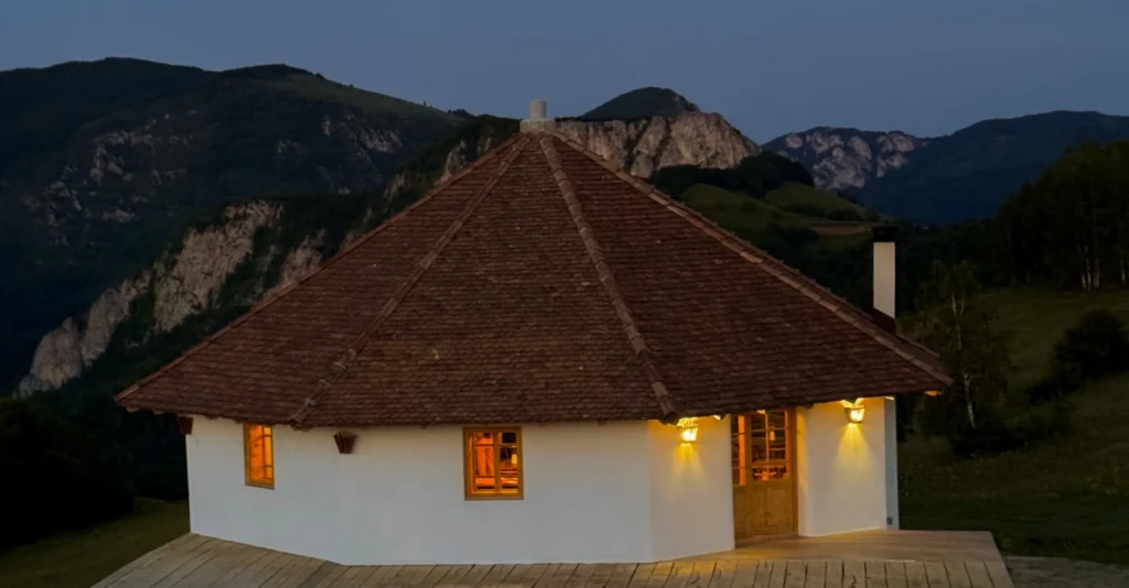La vreo oră și jumătate de Cluj, pe marginea drumului am observat un panou discret pe care scria „Vatra Apuseni – loc de tihnă”. Am parcat mașina și am descoperit ceva greu de descris în cuvinte: o construcție circulară, de un alb imaculat, cu geamuri mari și cu acoperiș masiv placat cu țiglă veche. Pare că a crescut din munte pentru a oferi o panoramă de 360 de grade asupra stâncilor din jur.